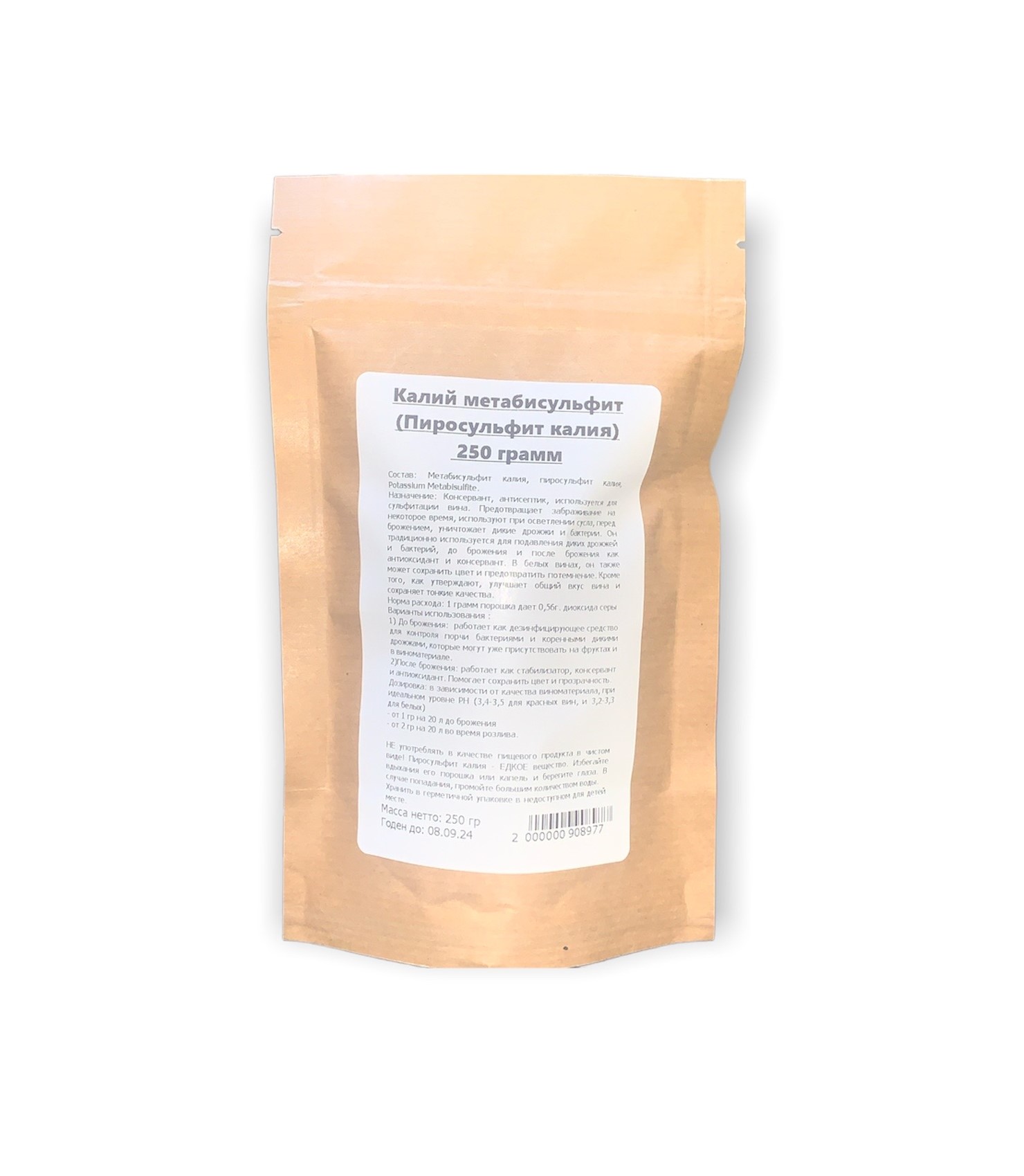 Препарат для сульфитации, используется в виноделии и пищевой промышленности. Метабисульфит калия, пиросульфит калия, Potassium Metabisulfite, консервант, антисептик, используется для стабилизации вин. Предотвращает забраживание на некоторое время, используют при осветлении сусла, перед брожением, уничтожает дикие дрожжи. Калия метабисульфит является общей добавкой для вина и дезинфицирующим средством. Без его применения невозможно произвести даже более-менее приличное вино. Он традиционно используется для подавления диких дрожжей и бактерий, до брожения и после брожения как антиоксидант и консервант. В белых винах, он также может сохранить цвет и предотвратить потемнение. Кроме того, как утверждают, улучшает общий вкус вина и сохраняет тонкие качества.